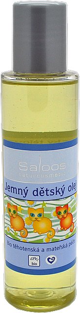 Jemný detský olej Saloos je ideálny na každodenné rozmaznávanie jemnej a citlivej detskej pokožky. Rastlinné bio oleje lisované za studena pokožku zvláčňujú, zvyšujú jej odolnosť a vytvárajú na nej jemný ochranný vrstvu. Priaznivé účinky bio rastlinných olejov z levandule a harmančeku pokožku regenerujú a hydratujú, zvyšujú jej odolnosť voči nepriaznivým vplyvom a zároveň jemná vôňa ovplyvňuje psychiku a celkovo upokojuje. Olej vhodný na každodennú starostlivosť na zapareniny a taktiež harmonizujúce masáže.