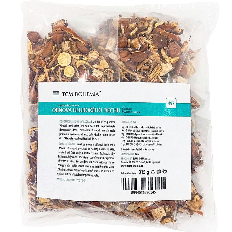 Produkt Obnova hlbokého dychu je zmes bylín tradičnej čínskej medicíny, ktorá obsahuje v jednom 45g sáčku nasledujúce zložky: 6 g koreňa Platykodonu veľkokvetého (Jie Geng), 9 g koreňa hviezdnice tatarskej (Zi Wan), 9 g podzemku Cynanchum stauntonii (Bai Qian), 6 g oplodia mandarinky obecnej (Chen Pi), 12 g semien marhule obecnej (Xing Ren) a 3 g koreňa sladkého drievka (Gan Cao). Celková hmotnosť balenia je 315g.