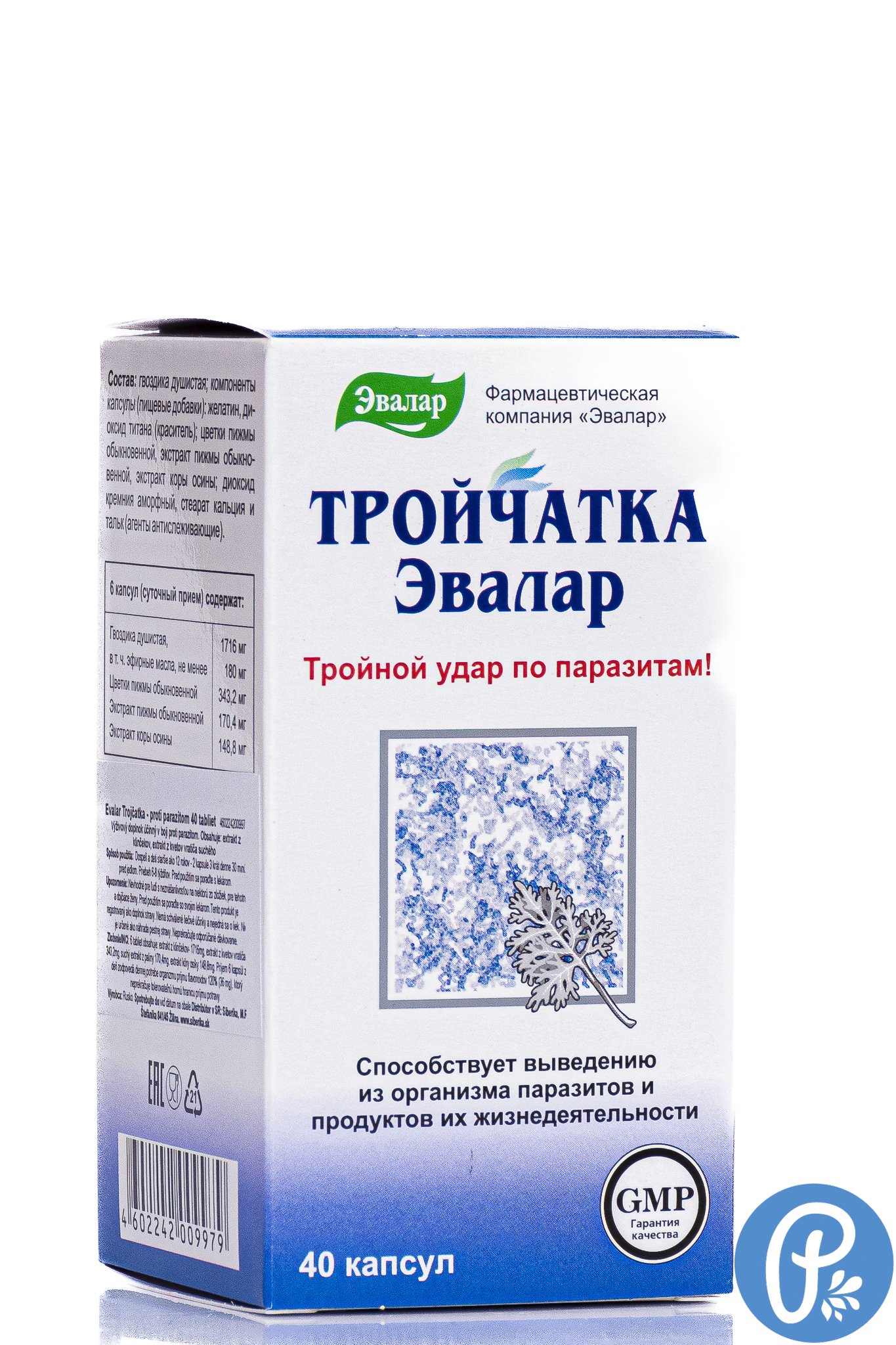 Zloženie/INCI/INGREDIENTS: 6 tabliet obsahuje: extrakt z klinčekov- 1716mg, extrakt z kvetov vratiča- 343,2mg, suchý extrakt z paliny 170,4mg, extrakt kôry osiky 148,8mg