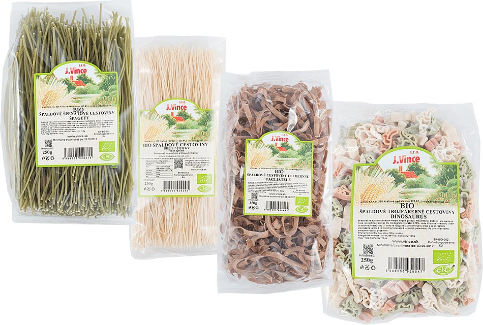 BIO cestovinami od J. Vince. Ponúkajú kopec benefitov. Nezameniteľná chuť, farba a vôňa je veľkou prednosťou a obohacuje ich jedinečnosť. Zásluhou vysokého obsahu vlákniny a živín tvoria súčasť chutnej a vyváženej stravy. Príprava zaberie pár minút. Špaldové cestoviny BIO Vince vynikajúco chutia pripravené na sladko i na slano.